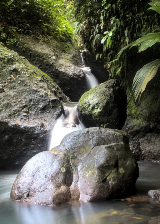 Ja, es regnete auch mal, aber bei den Temperaturen ist das auch egal. Tatsächlich meine ich aber das den Berg herabfließende Wasser, das sich an größeren Gefällen als wunderschöne Wasserfälle seinen Weg sucht. Nachdem wir sowohl von der Schönheit der Wanderung, der Schönheit des Wasserfalls und nicht zuletzt von der sportlichen Leistung Nimues angefixt waren, wollten wir den nächsten Wasserfall unsicher machen. Auserkoren waren die Cascades de Didier, zwei Wasserfälle, die unterhalb des Jardin de Balata den Berg hinabstürzen. Bevor wir jedoch die Wandersocken schwingen durften, verkümmerten wir zunächst auf der Strecke im Stau. Das bescherte uns unverhofft einen Umweg durch den Hafen und die Innenstadt von Fort de France. War immer noch so hässlich, wie wir es bei unserer ersten ungeplanten Durchfahrt wahrgenommen hatten. Erst auf den letzten wenigen Kilometern lichtete sich das Verkehrschaos und wir ergatterten einen Parkplatz vor Trailanfang. Leider blieb von Nimues Motivation die Wege alle selbst zu gehen dann doch nicht viel übrig. Da es aber zuvor und des Nachts tatsächlich länger geregnet hatte, war ich zunächst aber gar nicht so böse drum sie in der Kraxe schleppen zu müssen.