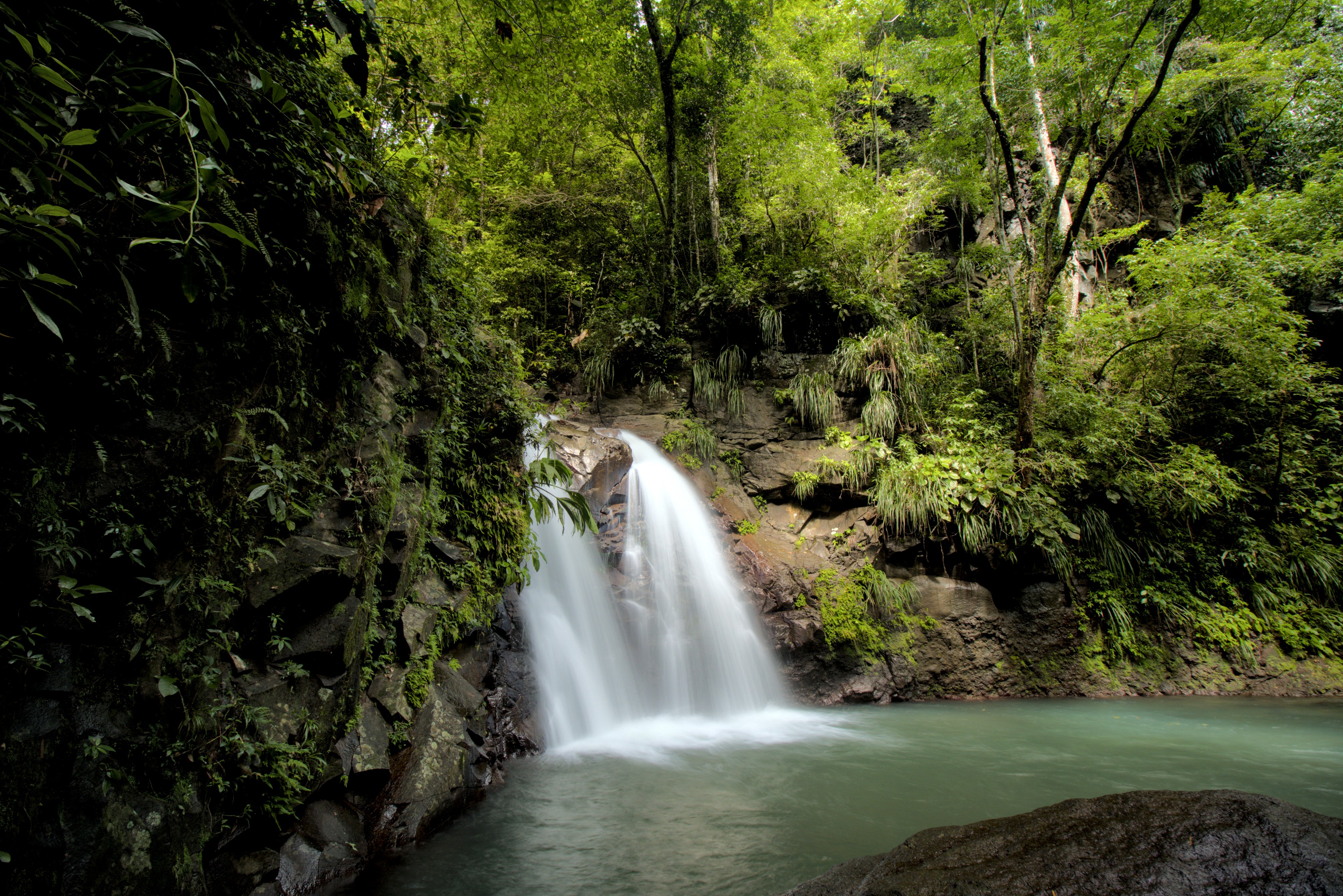 Ja, es regnete auch mal, aber bei den Temperaturen ist das auch egal. Tatsächlich meine ich aber das den Berg herabfließende Wasser, das sich an größeren Gefällen als wunderschöne Wasserfälle seinen Weg sucht. Nachdem wir sowohl von der Schönheit der Wanderung, der Schönheit des Wasserfalls und nicht zuletzt von der sportlichen Leistung Nimues angefixt waren, wollten wir den nächsten Wasserfall unsicher machen. Auserkoren waren die Cascades de Didier, zwei Wasserfälle, die unterhalb des Jardin de Balata den Berg hinabstürzen. Bevor wir jedoch die Wandersocken schwingen durften, verkümmerten wir zunächst auf der Strecke im Stau. Das bescherte uns unverhofft einen Umweg durch den Hafen und die Innenstadt von Fort de France. War immer noch so hässlich, wie wir es bei unserer ersten ungeplanten Durchfahrt wahrgenommen hatten. Erst auf den letzten wenigen Kilometern lichtete sich das Verkehrschaos und wir ergatterten einen Parkplatz vor Trailanfang. Leider blieb von Nimues Motivation die Wege alle selbst zu gehen dann doch nicht viel übrig. Da es aber zuvor und des Nachts tatsächlich länger geregnet hatte, war ich zunächst aber gar nicht so böse drum sie in der Kraxe schleppen zu müssen.