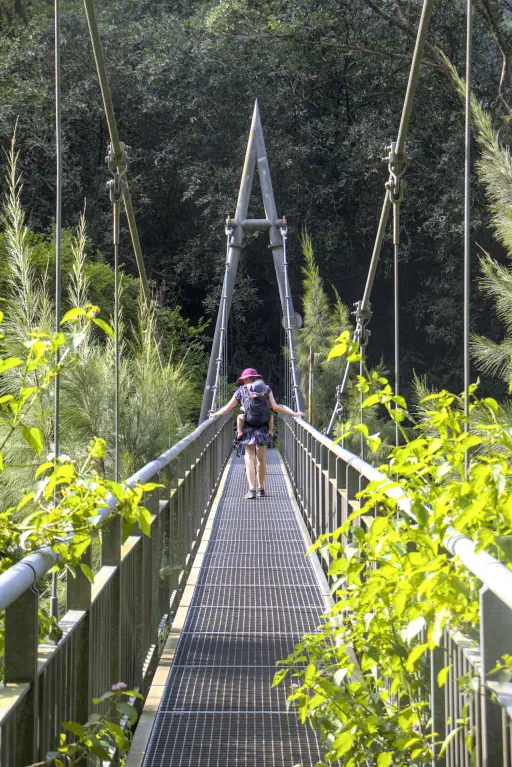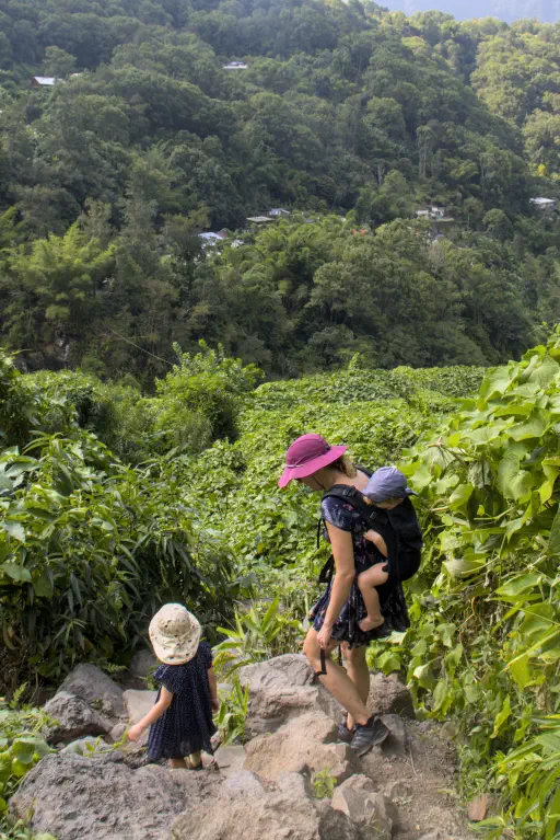 Die Wanderung begann mit einem kurzen Abstieg, einer Hängebrücke über einen reißenden Fluss (irgendwo müssen die ganzen Wasserfälle ja hinfallen) und mündete dann wieder in einen kräftezehrenden Aufstieg. Schattige Plätze waren rar gesäht, es war wieder einmal sehr heiß. Mit Nael und unserem üblichen Badegepäck auf dem Rücken kam ich wieder gar nicht klar. Schritt für Schritt trotzte ich meinem Körper aber die Belohnung ab: besagten Brautschleier Wasserfall. Und, hui Bub’, hatte sich das wieder gelohnt. Von dort oben hatte man eine sagenhafte Aussicht auf die Berge, zwischen denen Wolken hingen und man hatte einen Wasserfall, dessen Abkühlung nach dem Anstieg so segensreich war - krass! Auch hier versagen mir mal wieder die Worte. Nachdem ich zwei Liter Wasser abgepumpt hatte stellte ich mich unter den Wasserfall, schaute auf die Berge und wollte diesen Ort nie wieder verlassen. Ich neige ja selten zu lautstarken Gefühlsausbrüchen, doch hier überkamen mich meine bayerischen Gene und ich musste meine Freude einfach ins Tal jodeln.