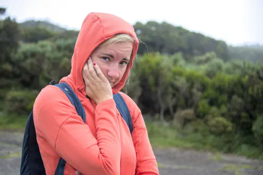 Wir saßen also vor der Nebelwand, hofften auf ein weiteres Wolkenloch, und snackten unser Lunchpaket. Das Wolkenloch kam nicht. Wir latschten noch mal zu einer anderen Aussichtsplattform, wo wir vielleicht ein anderes Wolkenloch hätten erhaschen können. Es kam nicht. Dafür tankten wir ordentlich Karma. Wie wir da so in den Nebel starrten, kippte, vermutlich wegen der Höhenluft, neben uns eine ältere Dame um. Ihr Sohn, natürlich sichtlich geschockt, fragte uns um Hilfe. Täschi war sofort in ihrem Arztmodus. Stabile Seitenlage, diesdas. Ich versuchte zu dolmetschen. Die Dame kam recht schnell zu sich und wir konnten mit einem Schokocroissant (Zucker, für den Kreislauf sagt Frau Doktor), Wasser (hilft eigentlich bei jedem Leiden, außer vielleicht bei einem Bauchschuss, sagt Frau Doktor) und Feuchttüchern (hilft gegen die Kotze auf dem Kleid, sagt Frau Doktor) aushelfen. Die beiden wollten dann keine Hilfe mehr, um zum Auto zurückzugelangen, aber das Fachpersonal riet noch, etwas die Beine hochzulegen. Die Bergwacht in Flipflops hatte ihren Einsatz erfolgreich abgeschlossen und konnte wieder zum Basislager ins Tal aufbrechen.