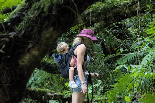 Es war tatsächlich eine wundervolle Wanderung entlang der Schlucht. Täschi trailrunnte uns mit Nael in der Trage vorneweg, Nimue und ich keuchten hinterher. Der Weg führte durch die Schlucht, an einem weiteren Wasserfall vorbei. Es gab ordentlich Kletterfelsen und Urwaldbäume für Nimue. Es gab Ausblick auf den reißenden Fluss, auf Wasserfälle und die Berge. Geradezu, um den Vortag vergessen zu machen, glänzte Nimue: sie wanderte die gesamten 4 km auf eigenen Beinen, war vom Auf- und Abstieg zum Bassin La Mer nicht zu schocken und war einfach unfassbar süß. Kein Anfall, pure Freude! Der Abstieg zum Bassin war dann tatsächlich steil, durch Nässe auch sehr rutschig, aber wenn wir nun schon einmal einen solchen Tag erwischt hatten, ließen wir uns auch davon nicht ins Bockshorn jagen.